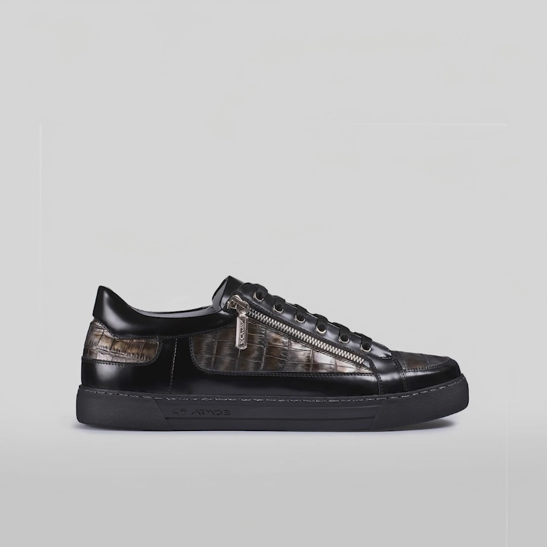 Мужские кеды из чёрной кожи с глянцевым золотым и серебристым крокодиловым принтом поднимут ваш выбор обуви на новый уровень. Уникальный узор в виде крокодиловой кожи излучает утончённость и дерзость, а сочетание полуматовой чёрной кожи с глянцевой отделкой золотого и серебряного цветов придаёт им изысканный вид. Металлические люверсы и логотип Armos на носке подчёркивают стильный дизайн, делая эти кроссовки универсальным дополнением к любому гардеробу. Оснащённые шнуровкой спереди и двумя молниями по бокам, эти мужские кеды с крокодиловым принтом обеспечивают плотную и удобную посадку. Резиновая подошва гарантирует комфорт и долговечность при носке в течение всего дня. Эти чёрные кеды с золотым и серебряным крокодиловым принтом идеально подойдут для добавления шика к любому образу.