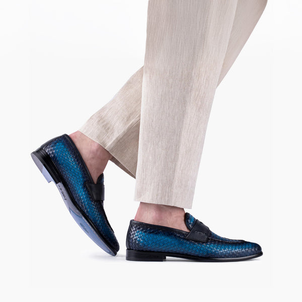 Мужские плетеные шойсы в синих тонах - это утонченное сочетание цвета и мастерства. Каждая нить обработана вручную с использованием техники патинирования, создающей великолепный градиент плавно перетекающих синих оттенков. Авторское плетение Armos, мокасиновый шов и союзка с прорезью гармонично дополняют друг друга. Обувь шойсы выполнены из натуральной телячьей кожи как внутри, так и снаружи. Кожаная подошва, прикреплена по технологии Blake stitching, а логотип Armos, ненавязчиво вытисненный на пятке, подчеркивает контраст и фирменный стиль. Мужские лоферы на лето говорят о роскоши в каждой плетеной детали и каждом оттенке синего.
