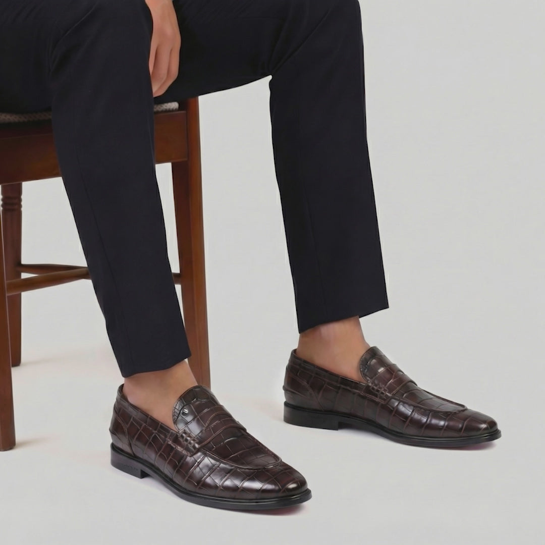 Мужские перфорированные лоферы – яркое дополнение к вашему гардеробу. Модель выполнена из телячьей кожи с крокодиловым принтом. Классическая перемычка пенни-лоферов элегантно располагается на верхней части, подчеркивая изысканный профиль обуви. Внутри мягкая стелька и подкладка из телячьей кожи обеспечивают длительный комфорт, а миндалевидный носок придает утонченный и вытянутый вид. Кожаная подошва прикреплена по технологии Blake stitching, имеет резиновые встакви, что гарантирует уверенный шаг и хорошее сцепление. Модель универсальна, легко сочетается как с костюмами, так и с повседневной одеждой.
