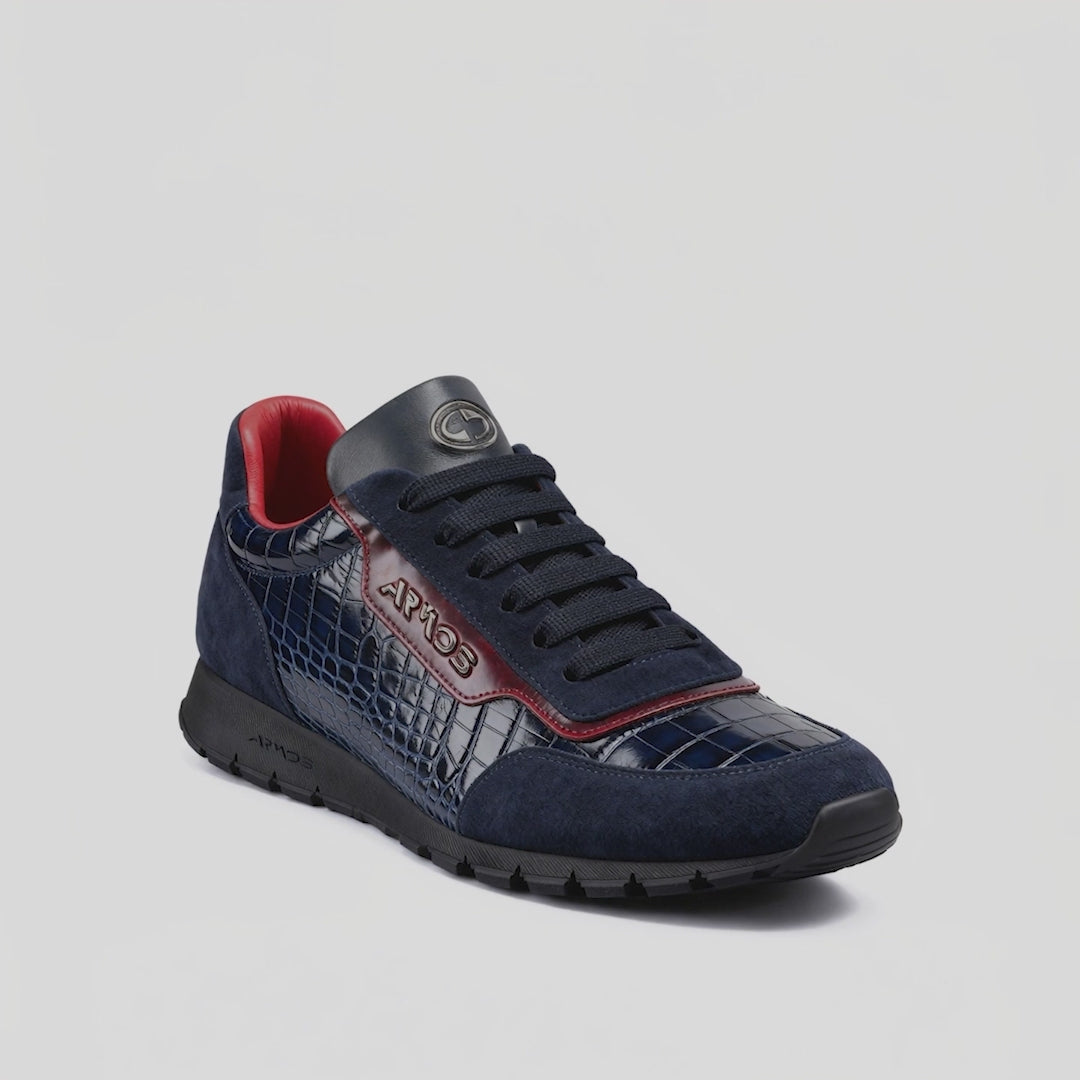 Кроссовки ARMOS темно-синего цвета — это идеальное сочетание современного стиля и комфорта. Изготовленные из премиальных материалов, они выделяются глянцевыми кожаными боковыми вставками с выразительной текстурой, напоминающей кожу крокодила. Передняя часть и пятка выполнены из мягкой замши, что добавляет дизайну утончённости, а акценты из лаковой кожи с эффектом "хамелеон" у шнурков создают эффект переливающегося цвета. Язычок из натуральной кожи, серебристый логотип ARMOS на боках и зоне шнуровки завершают образ, а глубокий темно-синий цвет с красными вставками задаёт общий стиль.