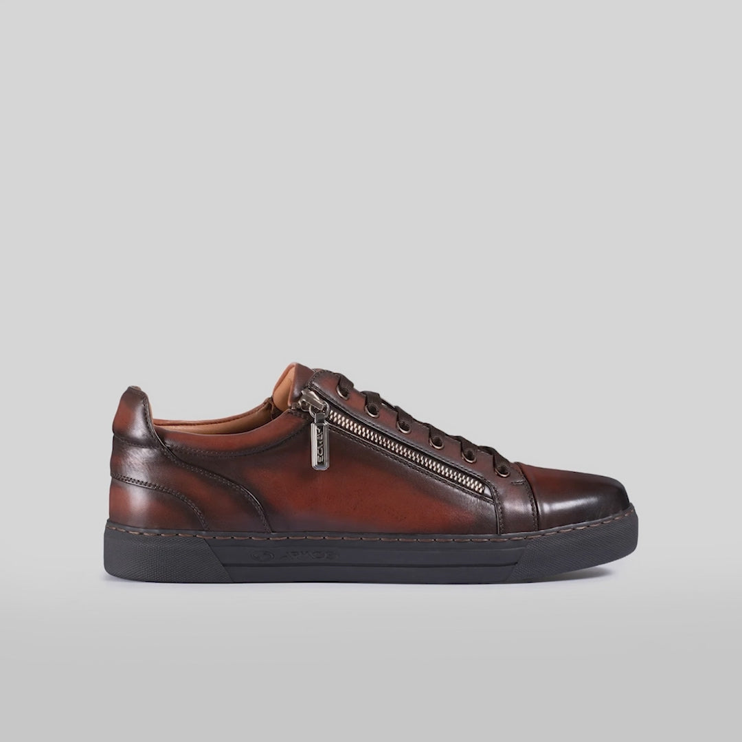 Погрузитесь в мир изысканной элегантности с этими мужскими низкими кроссовками из коричневой патинированной кожи. Изготовленные из высококачественной телячьей кожи с глубоким эффектом патины, эти кроссовки придают утончённый вид, который гармонично сочетается с любым гардеробом. Необычный оттенок какао-бобов добавляет дизайну глубины и индивидуальности. Эти кроссовки из коричневой патинированной кожи с металлическими люверсами и боковыми молниями удачно сочетают практичность и стиль. Шнуровка спереди обеспечивает надёжную посадку, а резиновая подошва гарантирует комфорт и долговечность. Дополните свой образ роскошью и изысканностью!